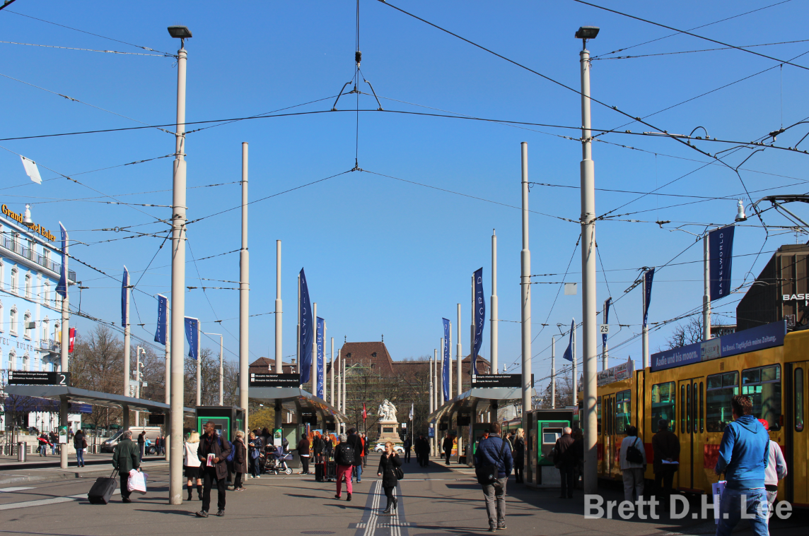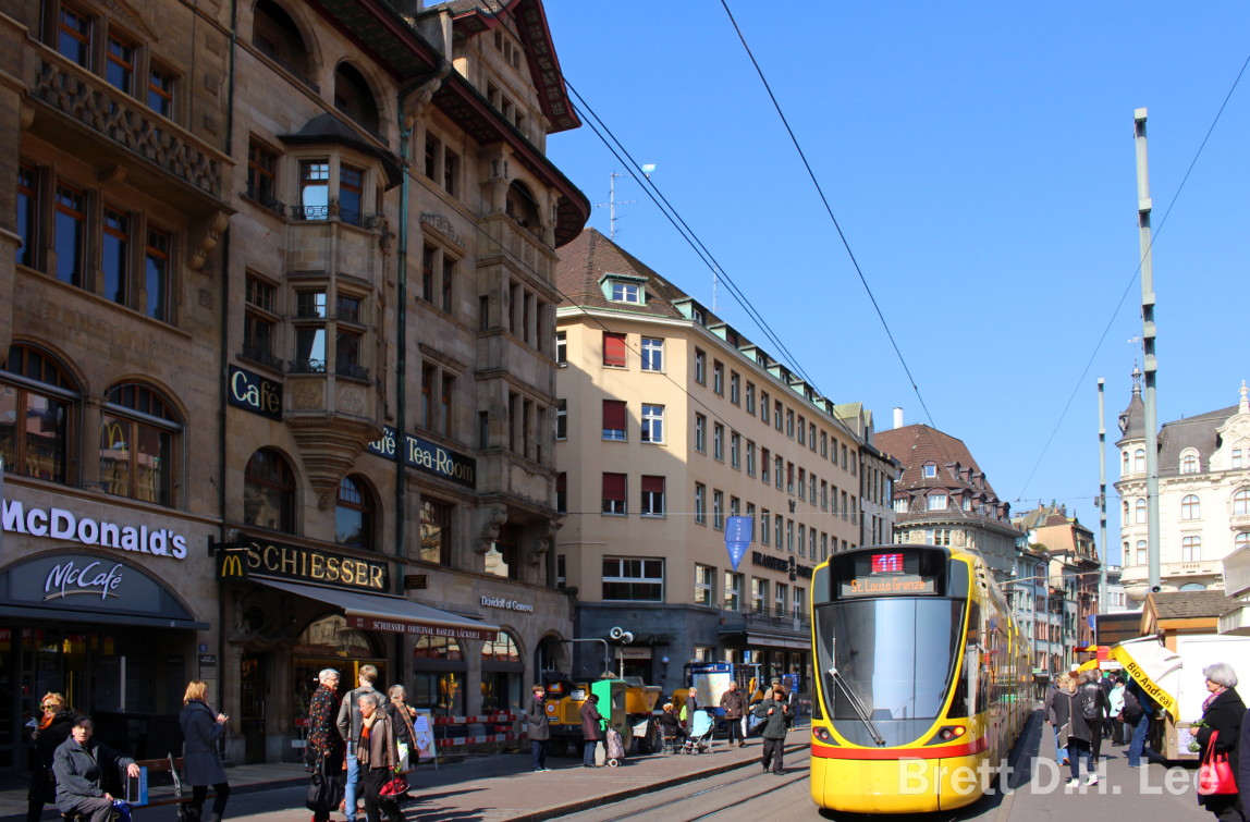 바젤 도심은 면적이 넓지 않아서 다 걸어도 된다. 조금 피곤해서 대로는 걷고 싶지않아 트램 잠시만 이용해서 이렇게 가게들이 다닥다닥 붙은 곳에서 내린다. 차는 거의 없는데 트램철로와 인도가 약간 애매모호하게 구별되어 있는...