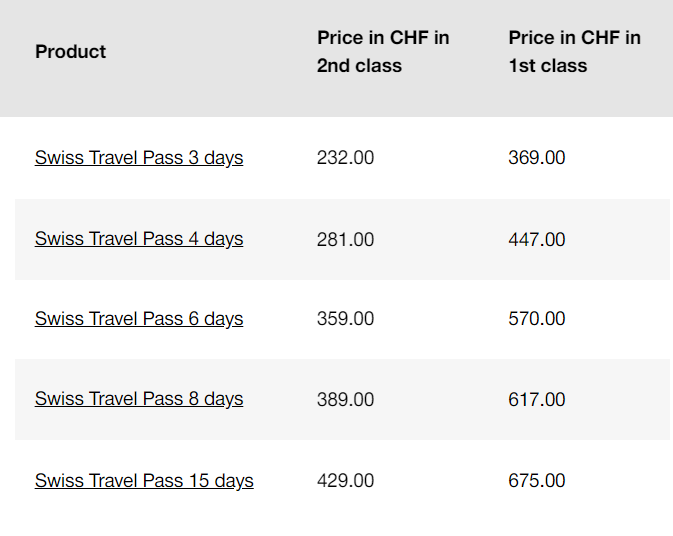 가격은 (일등석과 이등석으로 나뉜다. 스위스 프랑. 아래는 2022년도 가격표)