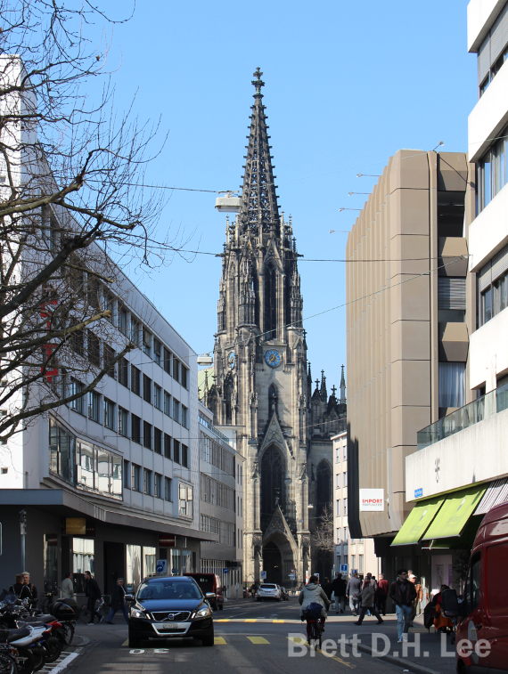 식사 후 길 앞으로 나오니 아까 보였던 교회건물이 다시 보인다. 스위스 고딕 복고양식 Swiss Gothic Revival으로 중세시절이 아닌 다소 최근(?) 19세기에 지어진 엘리자베스 교회 Offene Kirche Elisabethen. 1857년에 착공하여 1864년에 완공하였고 첩탑의 높이는 72미터. 정식 명칭에서 알 수 있듯이 "Open Church" 이다. 흔히 LGBTQ를 비롯한 모든 소수자의 입장을 다 수용하는 것으로 대부분의 사람들이 알고 있다. 영어로 Open Communion (열린 성찬)으로 표현하며 개신교의 한 줄기이다. 말 그대로 신자이던 이단이던, 교리에 어긋난다고 하는 동성애자까지 모두 성찬에 들게한다. Closed Communion 폐쇄적 성찬의 반대 개념으로, 성찬식은 특정 교회나 완전한 성찬이나 친목의 관계에 있거나, 그 목적을 위해 인정된 다른 교회나 다른 교회 구성원들을 위해 남겨진 성찬식이다.